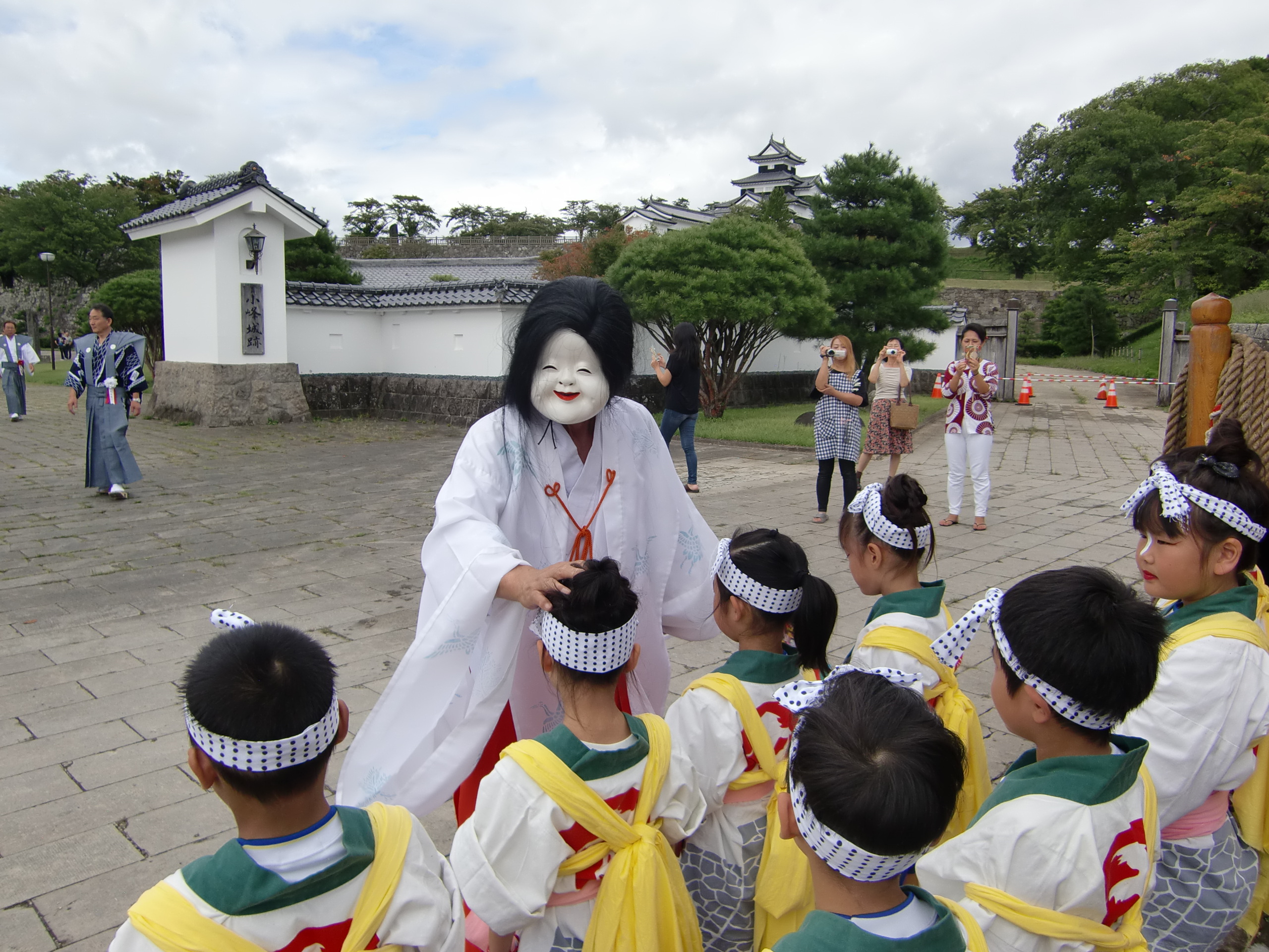 お出迎えの子供たちに天狗とおかめさんがなでなで。